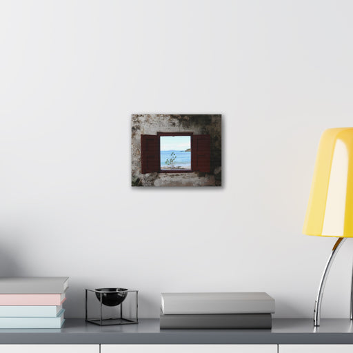 PrintifyStep back in time and enjoy a slice of paradise through this enchanting window at Cinnamon Bay, St. John. Weathered stone walls and vibrant red shu...
